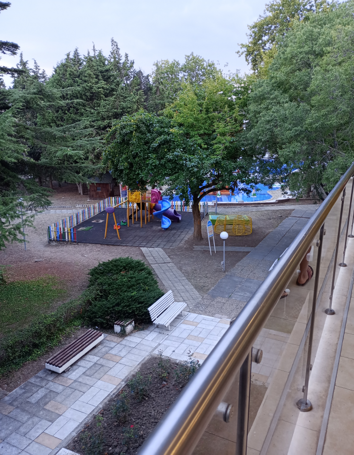 Amplasarea hotelului in partea de sus a stațiunii, înconjurat pe pun, cedru, platani etc. Din balcon privești în parc. Distanța până la scara rulanta cca 100 m și până la plaja 150 m. Piscina hotelului cu apa minerala ideala pentru cine înoată. In rest hotelul e modest, mâncarea la fel, barul, snack modest.